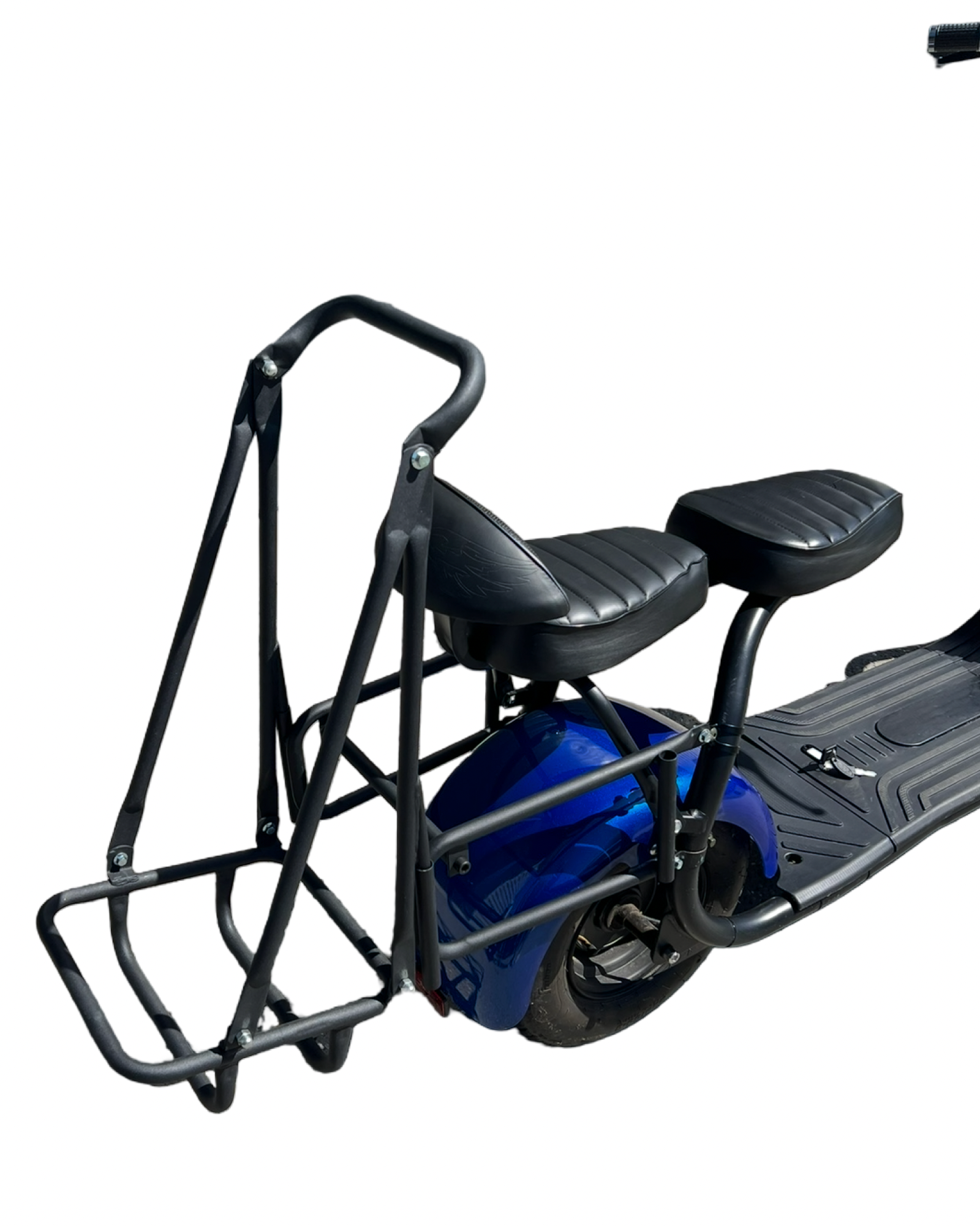 Golf Bag Carrier for Fat Wheel Scooter with suspension arm above rear mudguard and Fat Tyre Scooters with no rear suspension.